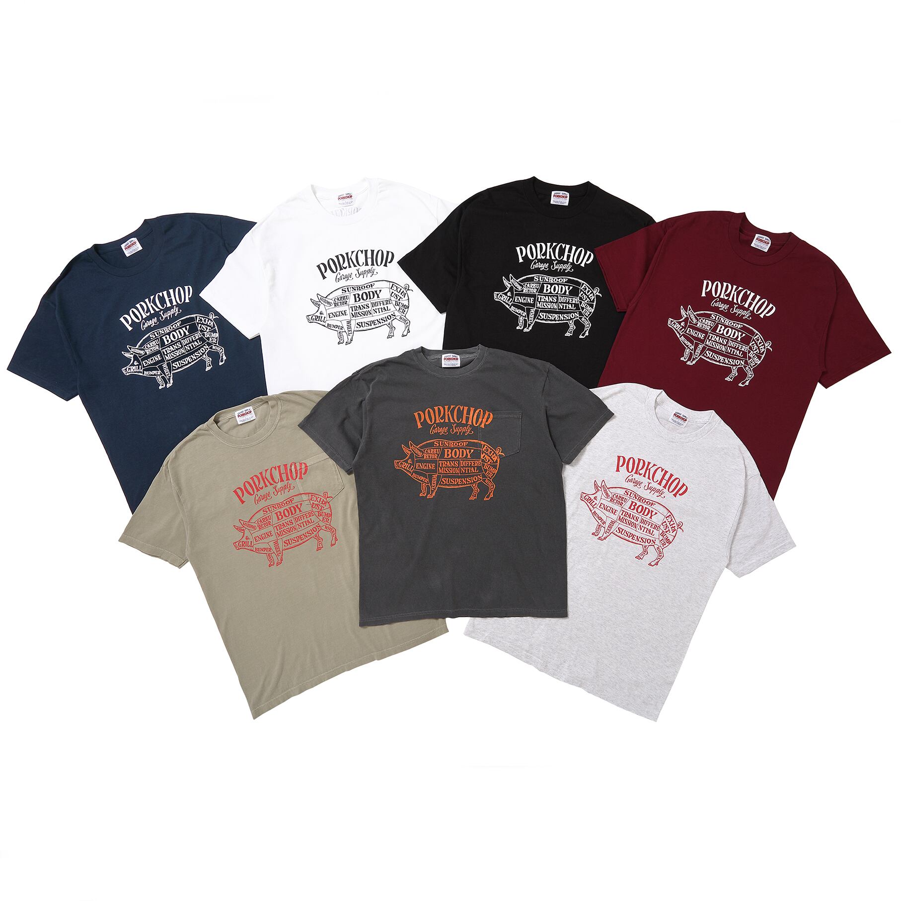 PORK FRONT TEE 25 COLOR:ASH FABRIC:6.0oz COTTON 100% SIZE : 着丈×身幅×袖丈 S:67×46×20 M:72×51×21 L:77×56×23 XL:80×61×24