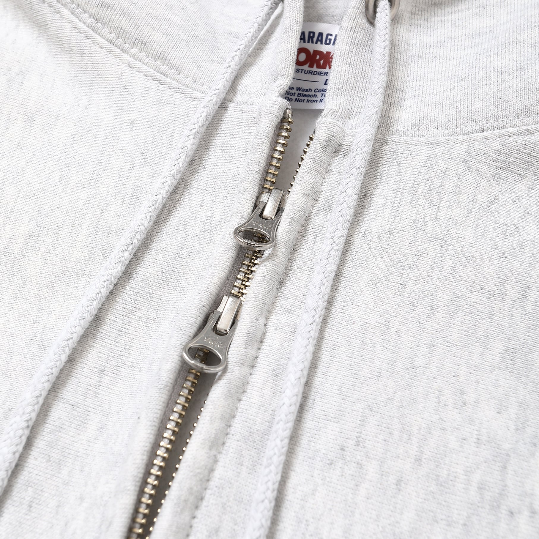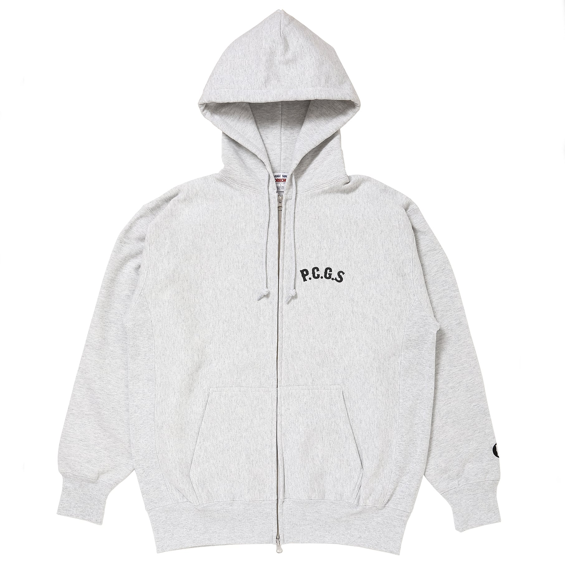 CIRCLE PORK ZIP UP HOODIE COLOR:ASH FABRIC:12oz COTTON 75%・POLYESTER 25% (Brushed back) SIZE : 着丈×身幅×肩幅×袖丈 S:69×55×50×61 M:72×58×53×62 L:75×61×56×63 XL:78×64×59×64
